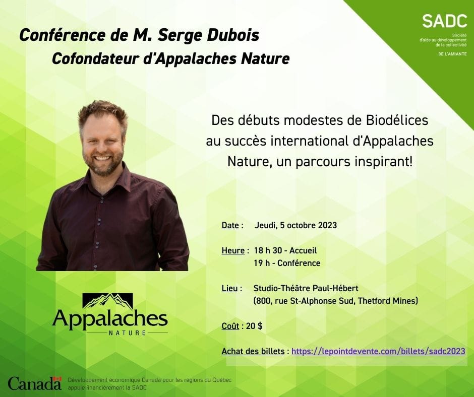 Le 5 octobre prochain, venez assister à la conférence de M. Serge Dubois, cofondateur d'Appalaches Nature. Ce dernier vous dressera un portrait du chemin parcouru en tant qu'entrepreneur, des débuts modestes de Biodélices jusqu'au succès international d'Appalaches Nature.